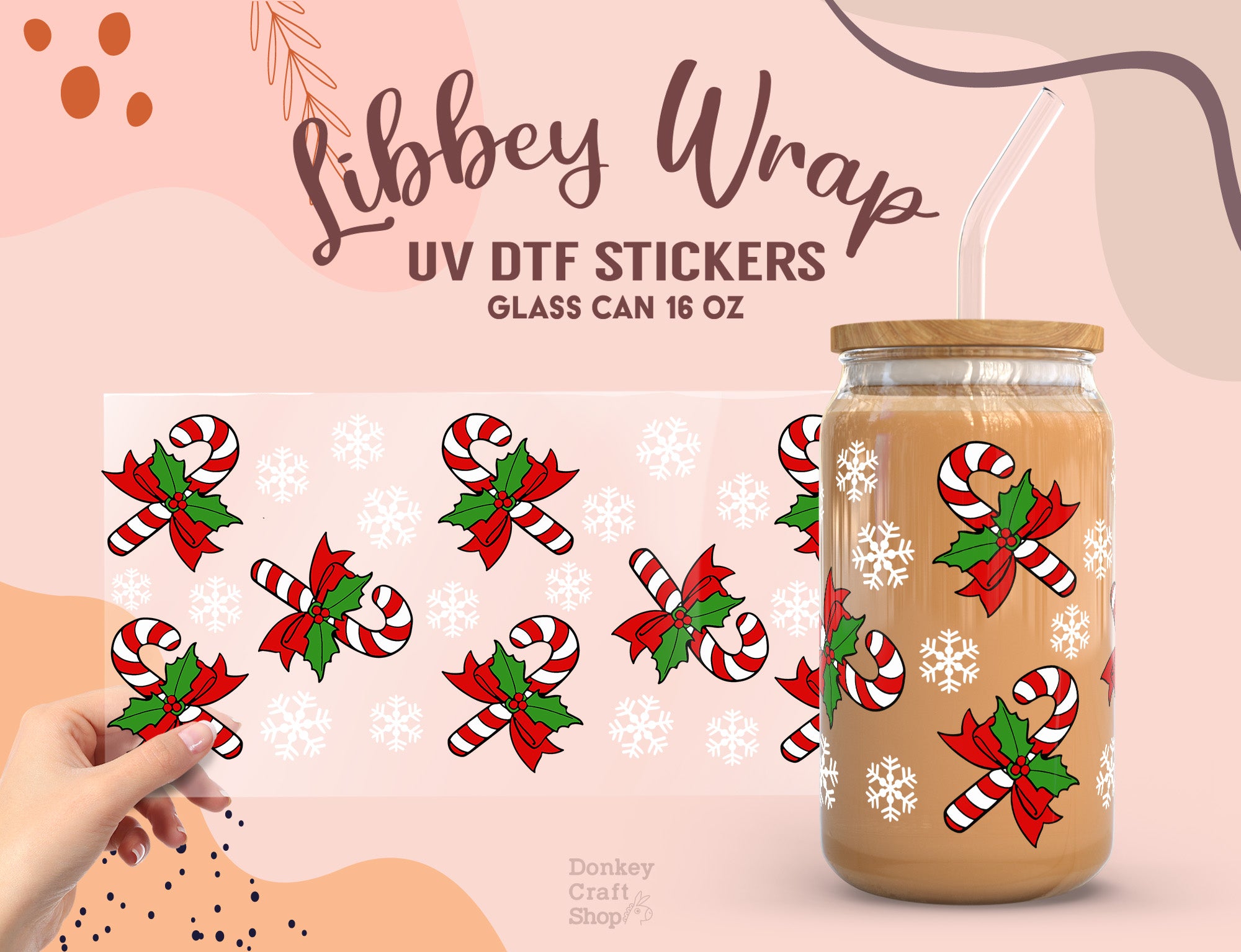 Celebrate the holiday season with our Candy Cane Christmas UV DTF Wrap, designed for 16oz Libbey glass cans (cup not included). Featuring festive candy canes, holly leaves, and snowflakes, this wrap brings cheerful Christmas vibes to every sip. Perfect for seasonal drinks and holiday gifts.