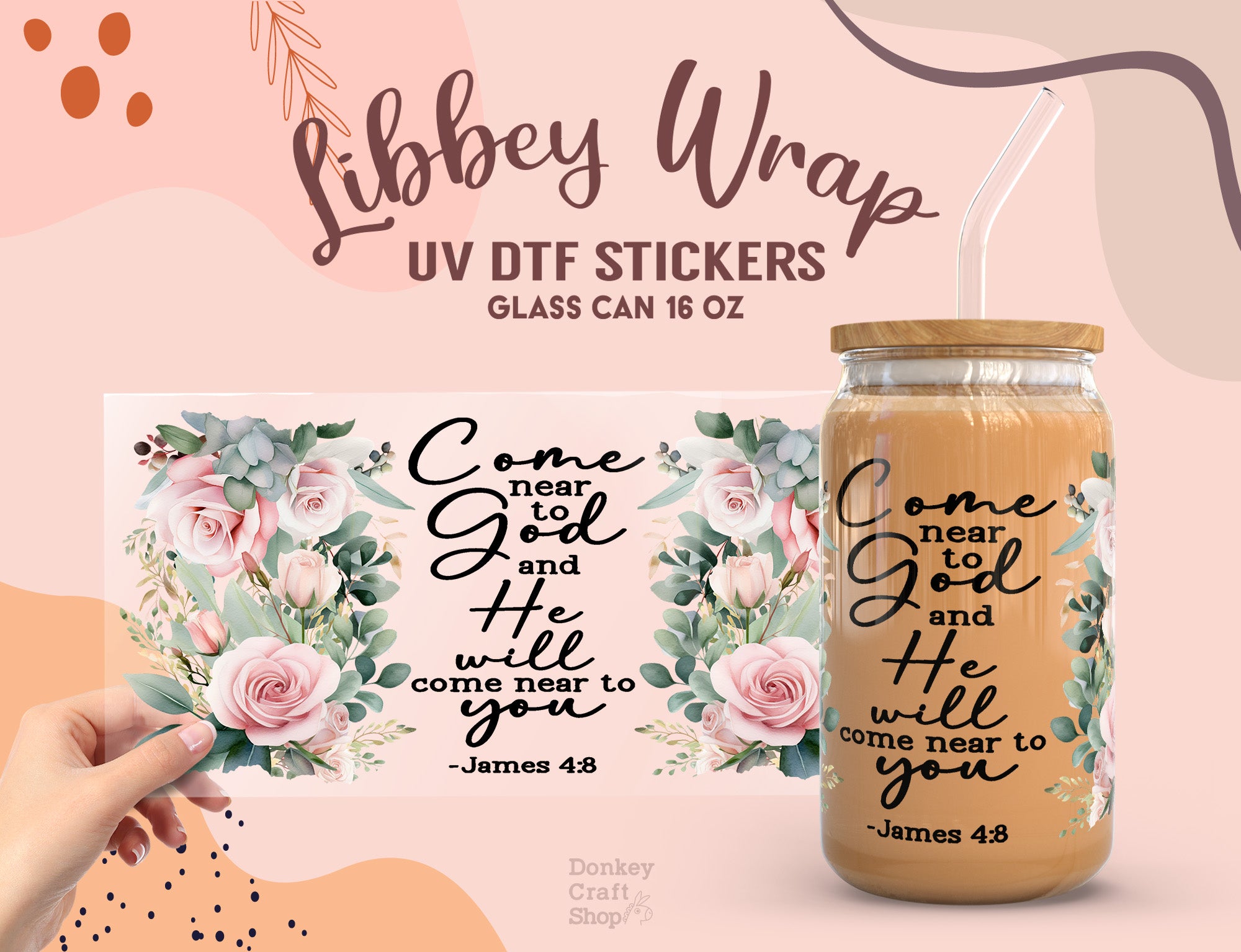 Bring encouragement to your daily routine with our Come Near to God UV DTF Wrap, designed for 16oz Libbey glass cans (cup not included). Featuring the uplifting verse from James 4:8 surrounded by elegant watercolor roses and greenery, this wrap is perfect for faith-based gifts, church events, or personal inspiration.