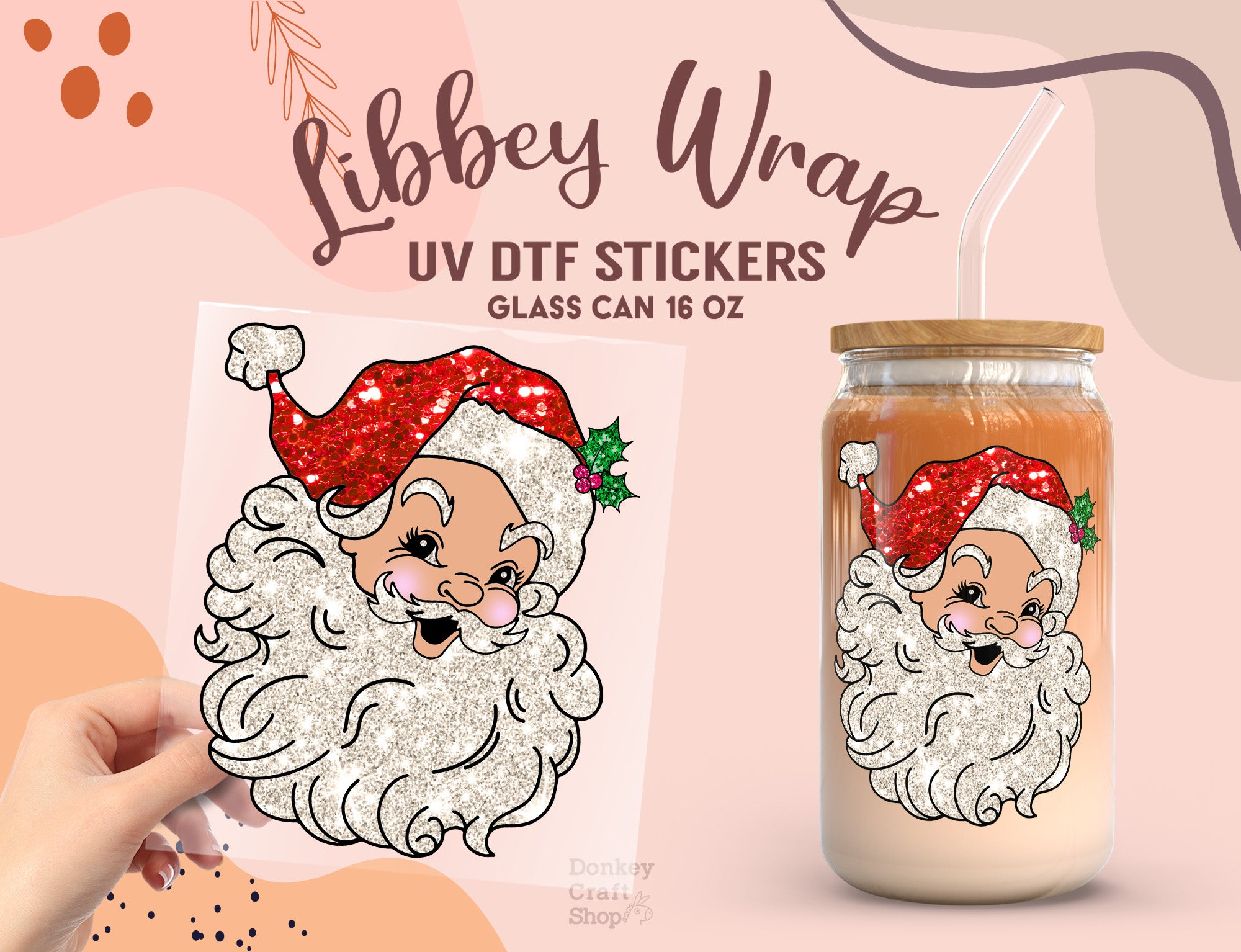Bring holiday cheer to your favorite drinks with our Glitter Santa Face UV DTF wrap, perfectly sized for 16oz Libbey glass cans (glass not included). Featuring a sparkling Santa hat and beard, this wrap is festive, fun, and perfect for Christmas drinks, parties, and seasonal gifts.