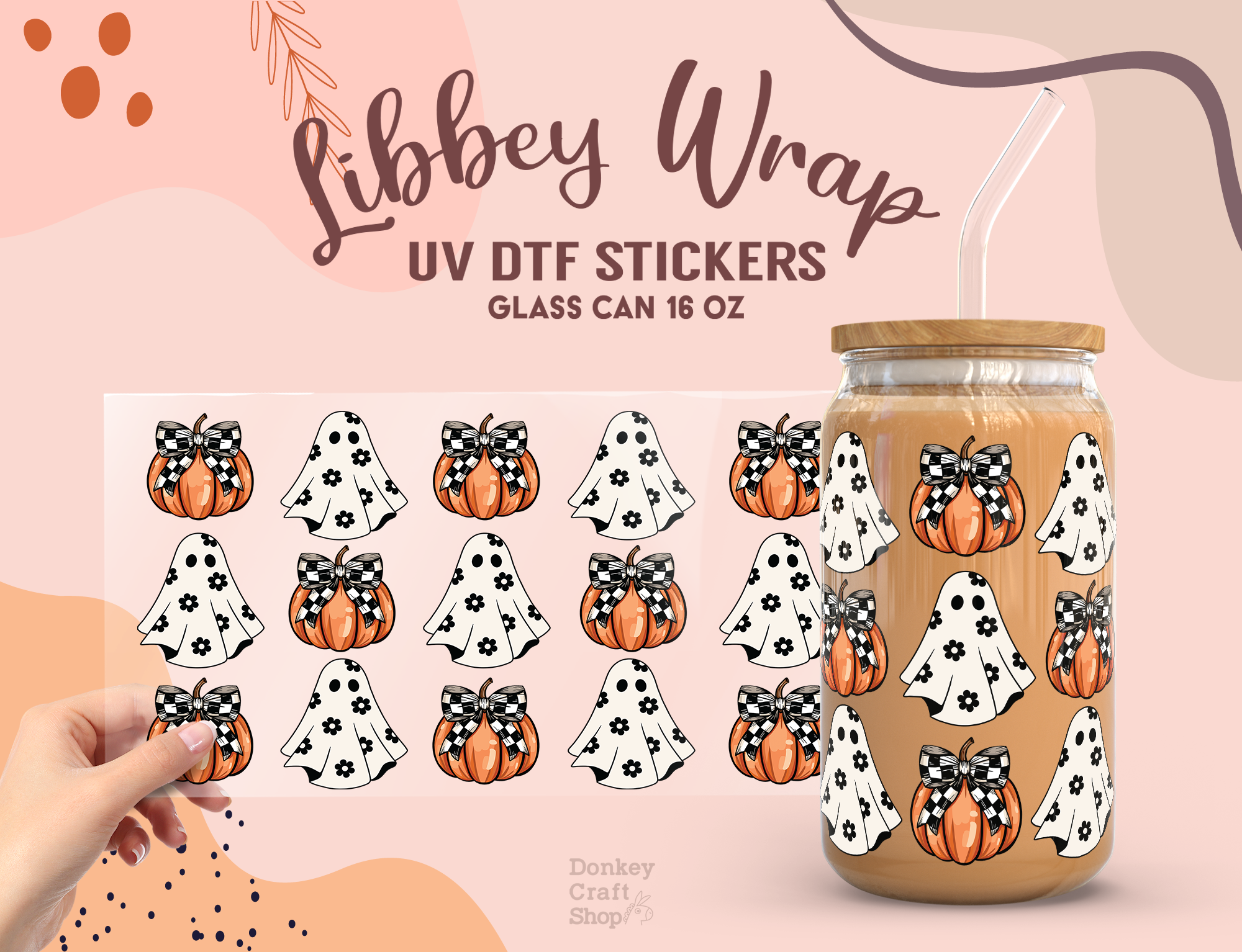Celebrate Halloween in style with our Ghost & Pumpkin UV DTF adhesive cup wrap, designed to fit a 16oz Libbey glass can (cup not included).