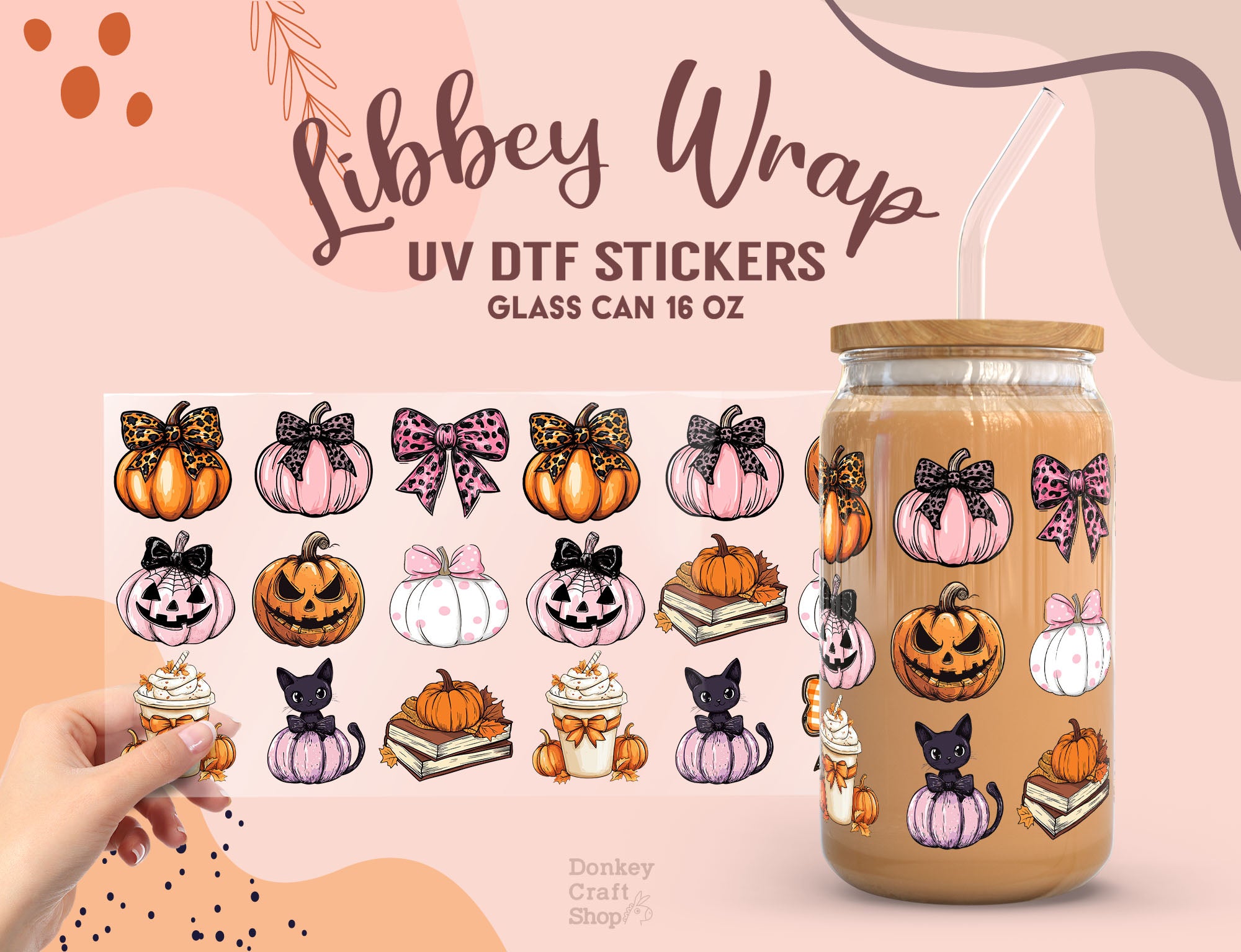 Celebrate Halloween in style with this Pumpkins & Black Cat UV DTF Wrap, made to fit 16oz Libbey glass cans (cup not included). Featuring chic bows, pastel pumpkins, spooky jack-o’-lanterns, and cute black cats, this wrap is the perfect mix of spooky and stylish.