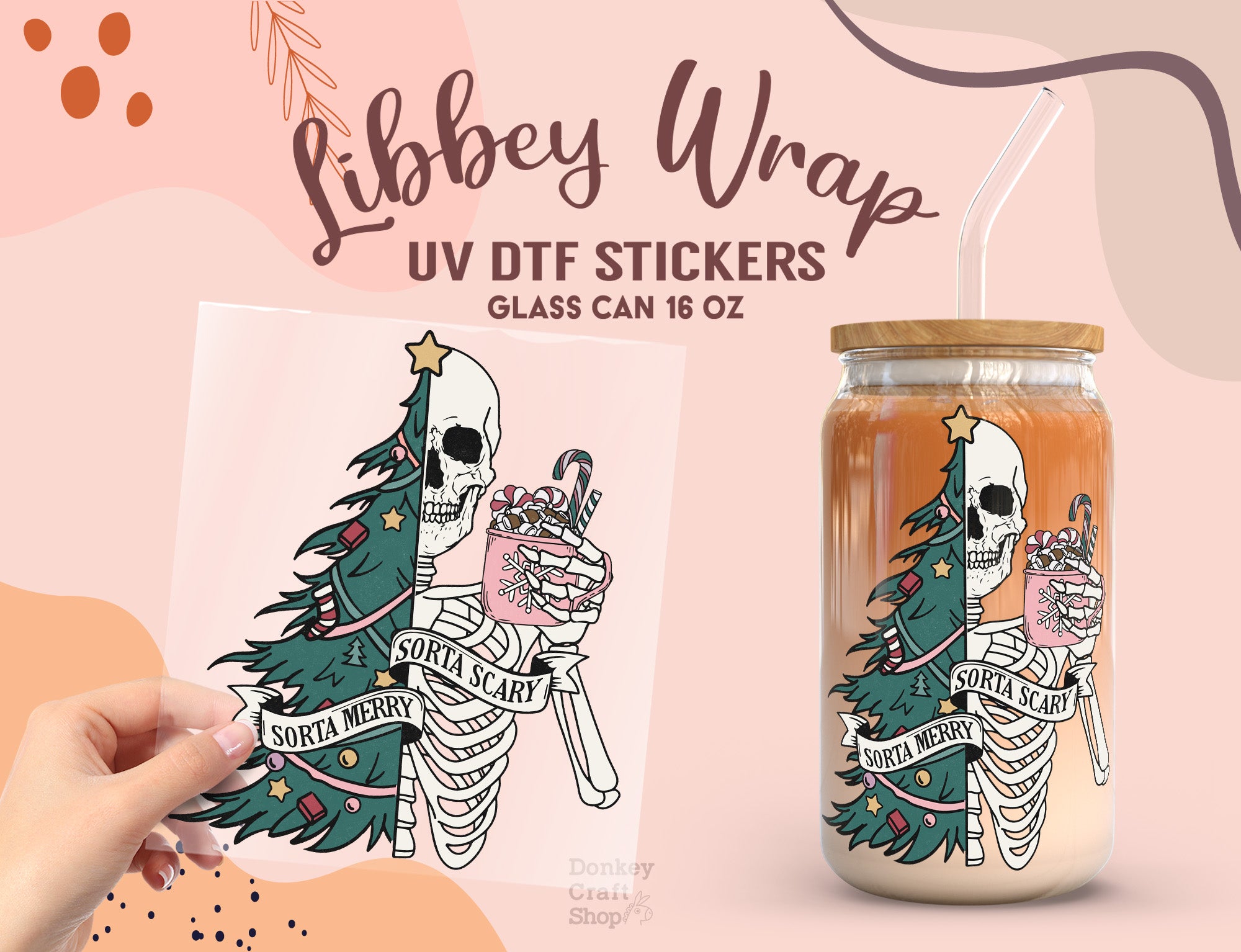 Add a spooky yet festive vibe to your favorite drinks with our Sorta Merry Sorta Scary UV DTF cup wrap, perfectly sized for a 16oz Libbey glass can (glass not included). Durable, waterproof, and vibrant — this design is both creepy and cheerful!