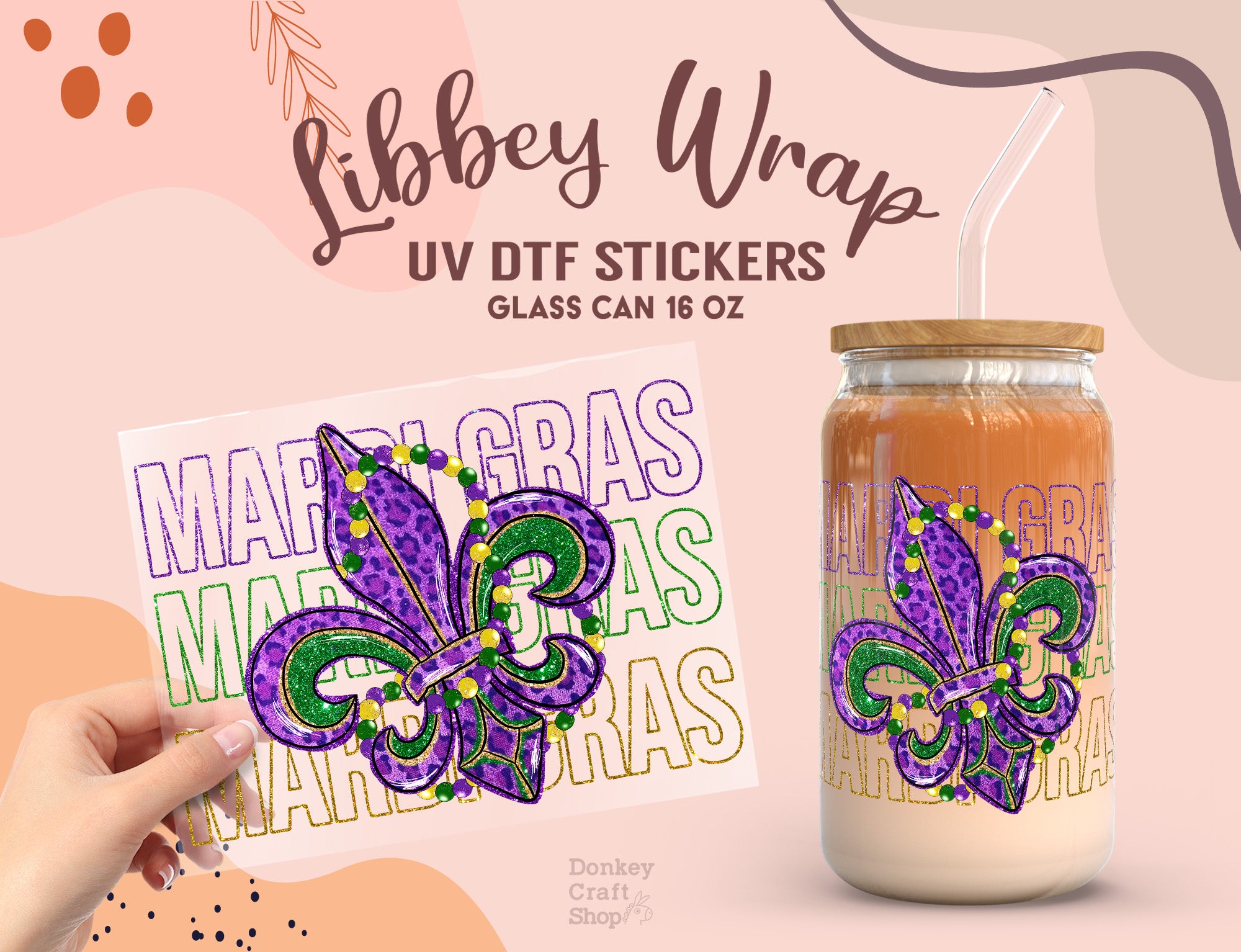 Celebrate in style with this Mardi Gras UV DTF wrap, designed for 16oz Libbey glass cans (glass not included). Featuring a glittery Fleur-de-Lis, beads, and bold Mardi Gras lettering, it’s the perfect festive touch for your drinkware.