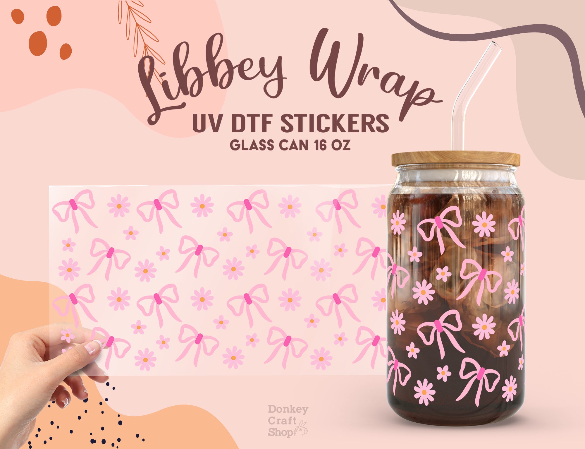Add a sweet and feminine touch to your 16oz Libbey glass can with this Pink Bow & Flower UV DTF wrap. Featuring a playful all-over pattern of bows and flowers, this durable UV DTF sticker is waterproof, scratch-resistant, and long-lasting. Easy to apply—just peel and stick, no heat or water required. Perfect for coffee cups, iced drinks, personalized gifts, parties, and DIY crafts.