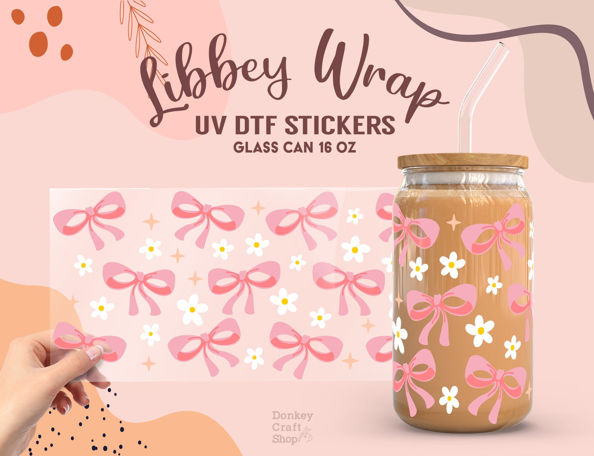Pink Bows UV DTF, Ready to Transfer, 16 oz Libbey Glass Can Wrap UV008