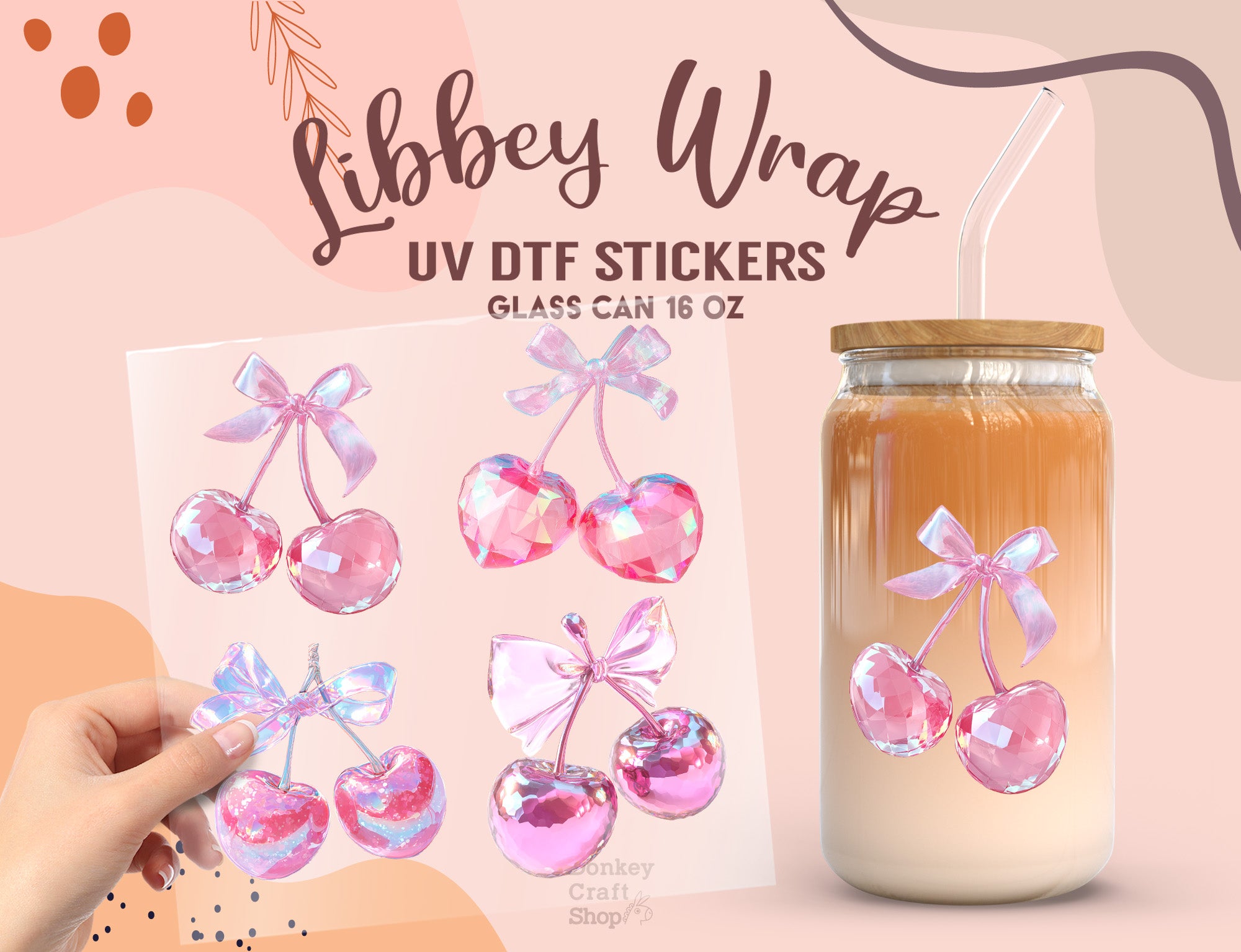 Add a touch of sparkle and sweetness to your favorite drink with this Pink Crystal Cherry Bow UV DTF Cup Wrap, made to fit 16oz Libbey glass cans (cup not included). 🍒💎