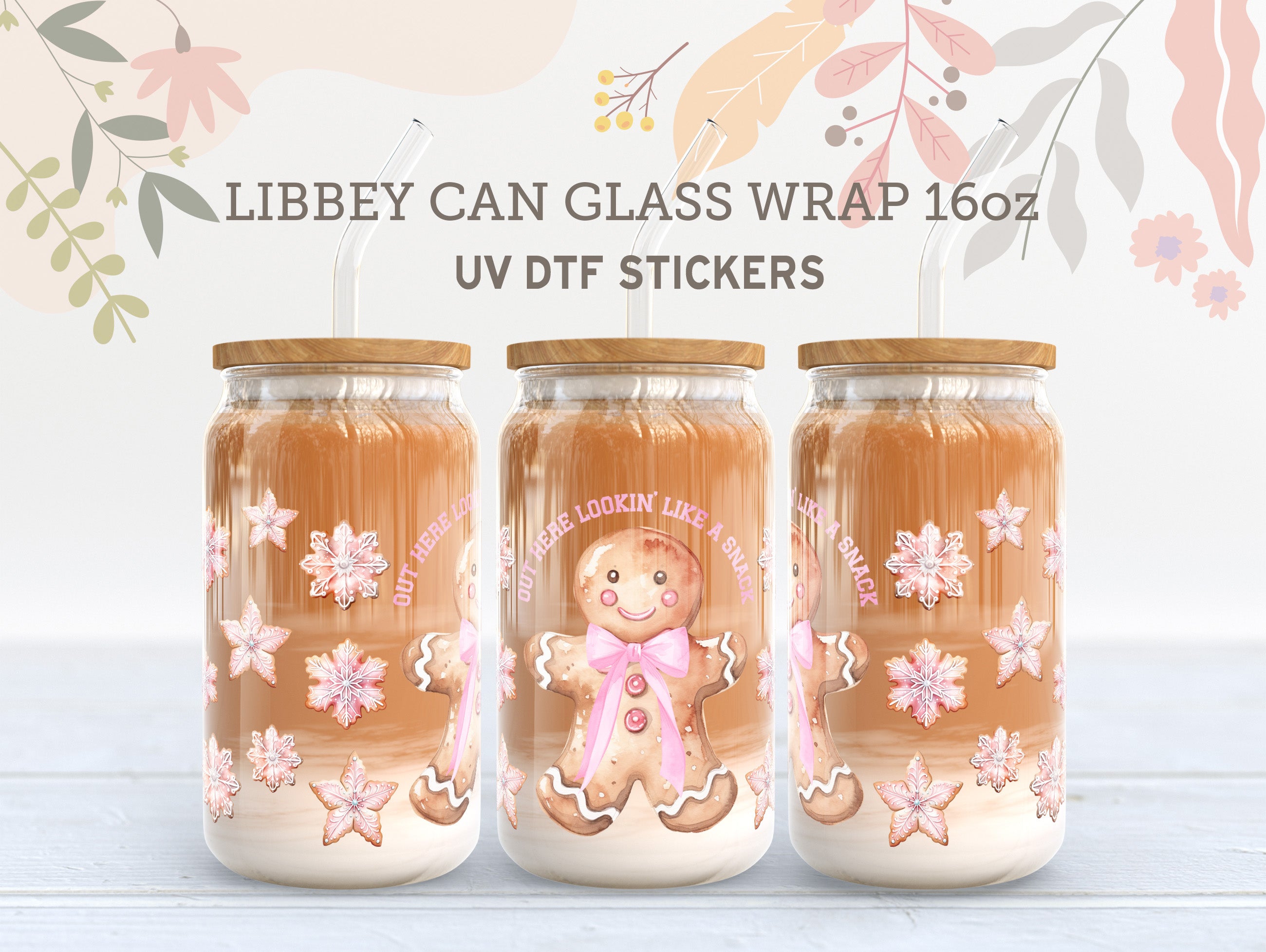 Sweeten your holidays with our Gingerbread Man UV DTF wrap, made for 16oz Libbey glass cans (glass not included). Featuring an adorable gingerbread man with snowflakes and the fun phrase “Out Here Lookin’ Like a Snack”, this design is perfect for Christmas drinks, parties, and festive gifts.