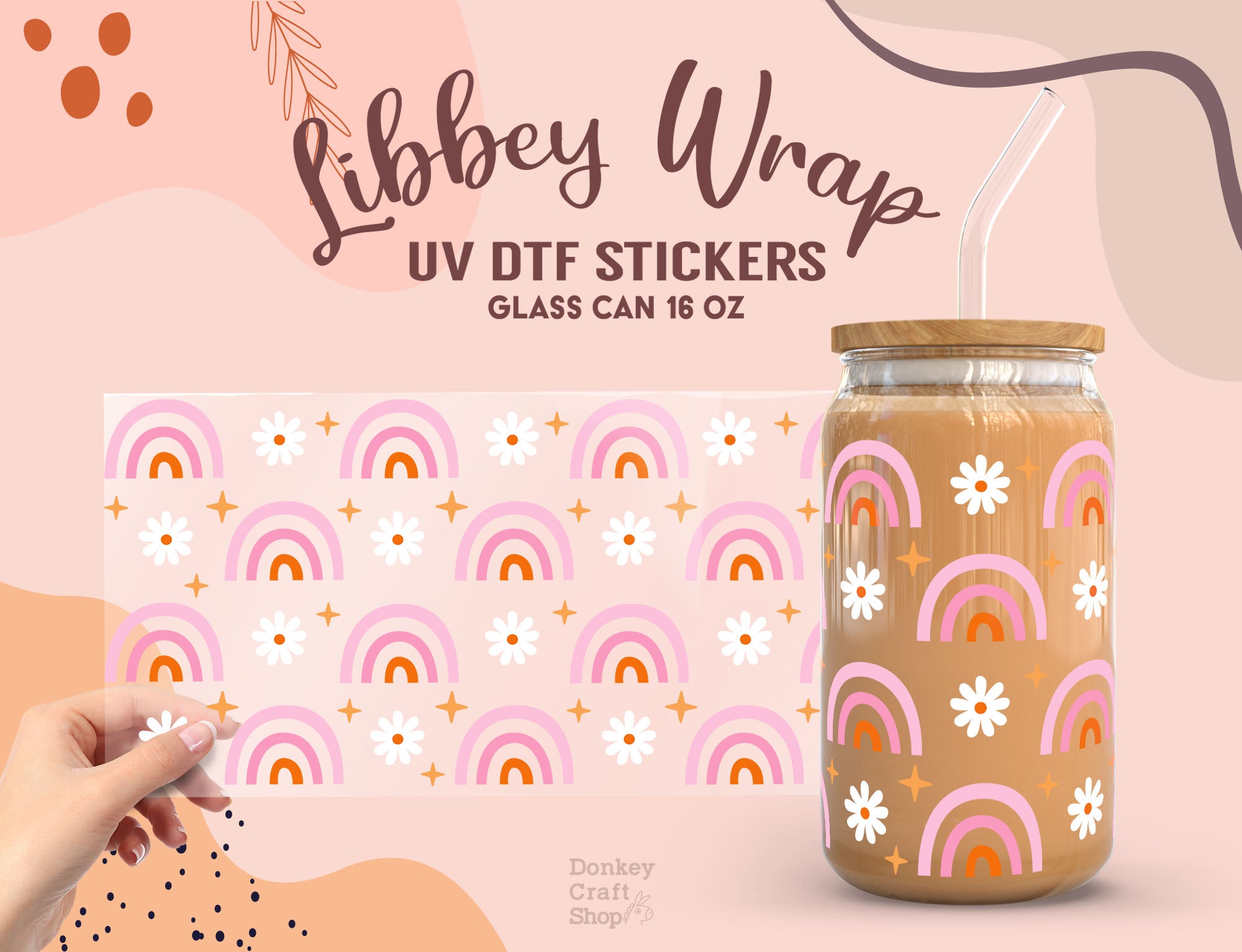 Brighten your favorite drinks with this Rainbow Daisy UV DTF wrap, perfectly sized for 16oz Libbey glass cans (glass not included). Featuring soft pink rainbows, cheerful daisies, and cute star accents, this wrap adds a fun and playful vibe to your cup collection.