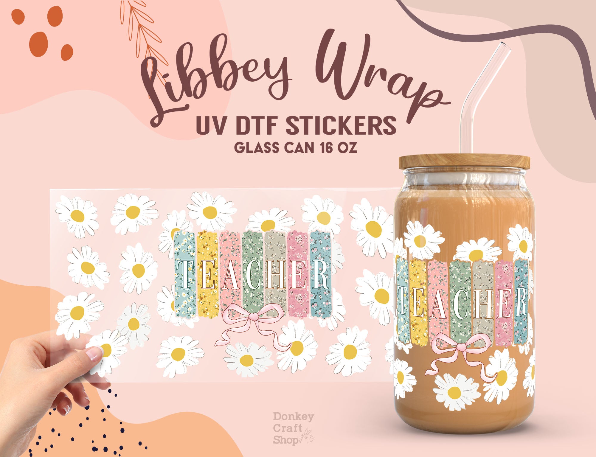 Celebrate teachers with this Teacher Daisy UV DTF Wrap, made to fit 16oz Libbey glass cans (cup not included). Featuring pastel glitter-style pencils spelling "TEACHER" surrounded by cheerful daisies, it’s the perfect teacher appreciation gift or back-to-school accessory.