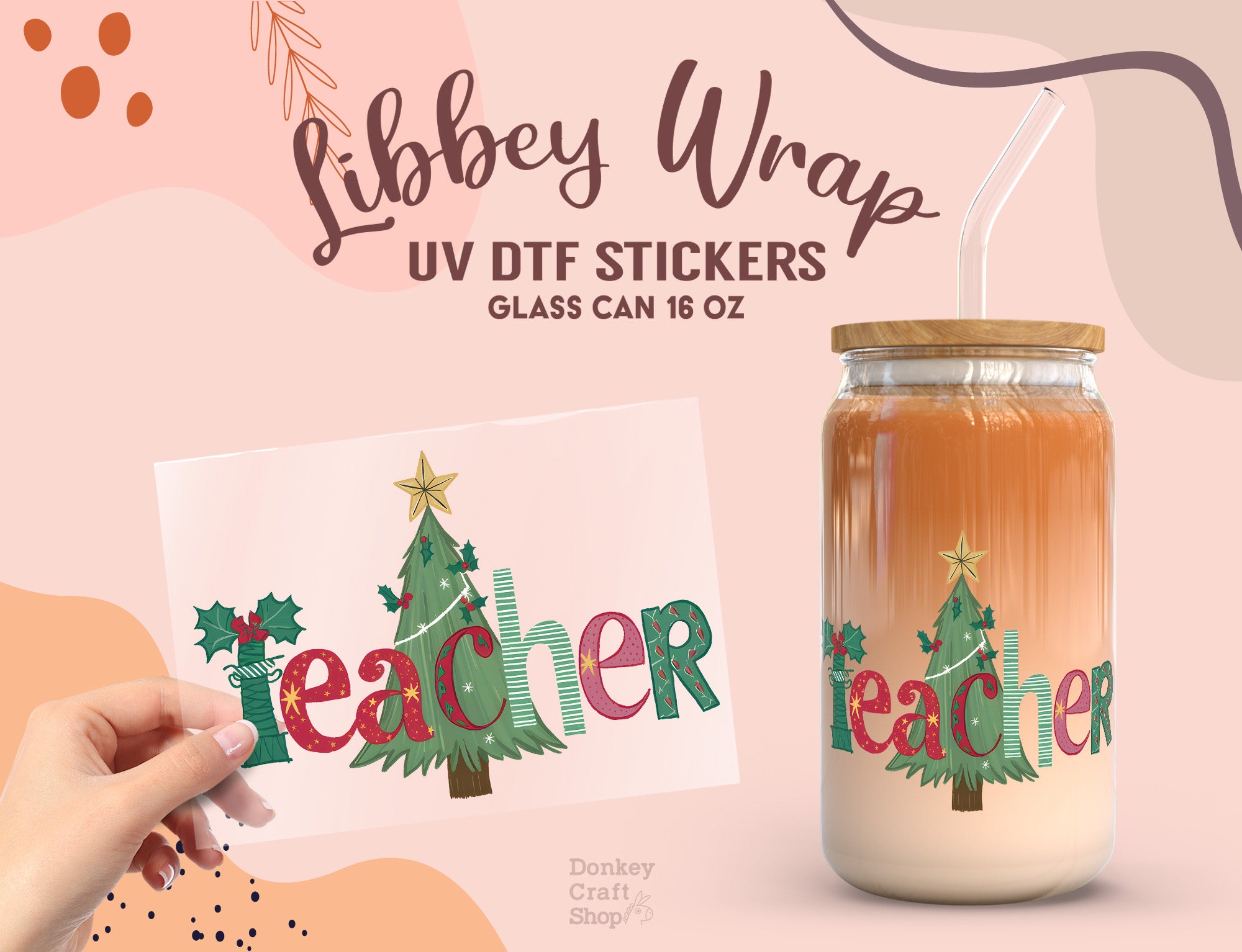 Add festive charm to your 16oz Libbey glass can with this Teacher Christmas UV DTF wrap sticker. Durable, easy to apply, and perfect for holiday drinks or gifting. This thoughtful design features the word “Teacher” decorated with a Christmas tree, festive holly, and cheerful seasonal colors—making it the perfect holiday gift for educators or a fun addition to your own glassware collection.